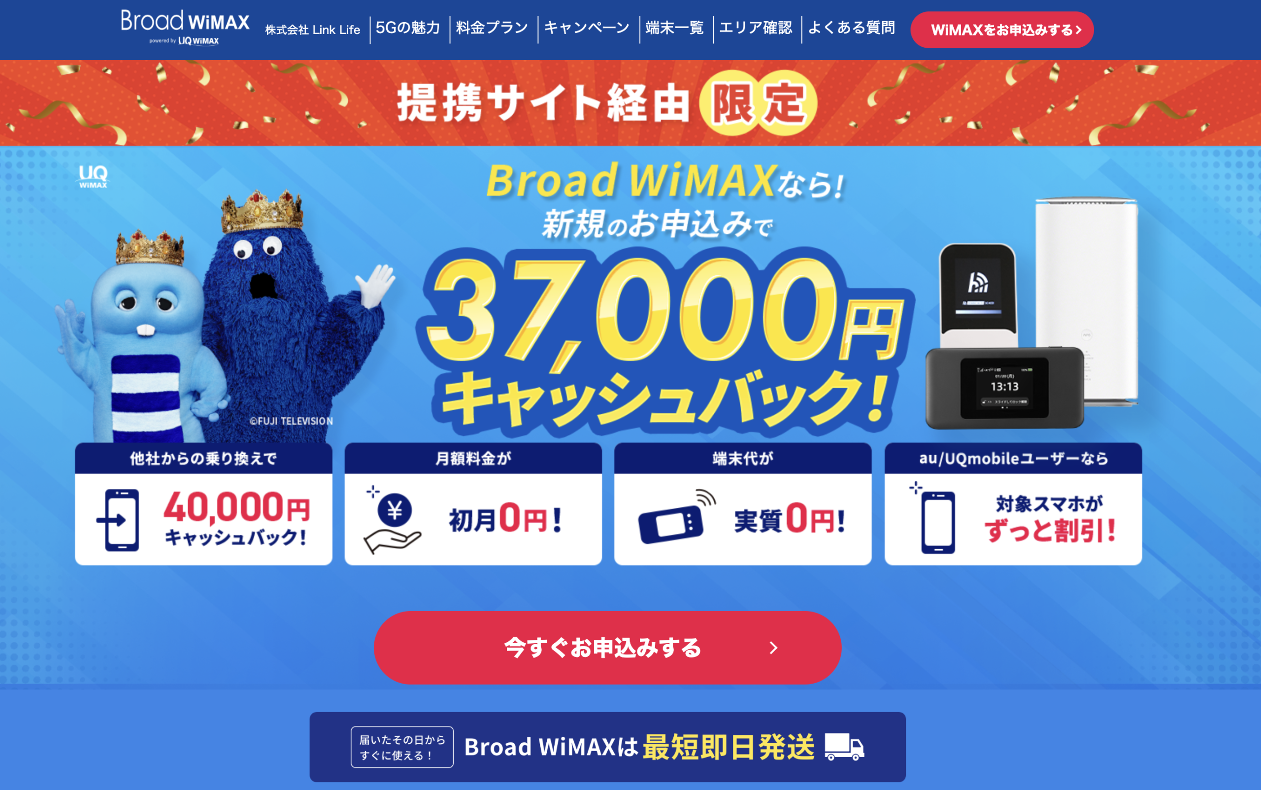 Broad WiMAXでは、月額料金が初月0円、2カ月目以降はずっと4,708円と業界最安級です。さらに、端末代が実質無料となるキャンペーンに加え、新規契約なら最大37,000円のキャッシュバックが受けられるため、他社からの乗り換えコストを抑えられます。