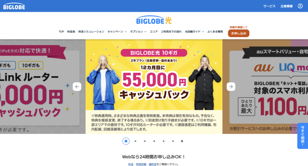 ビッグローブ光は大手キャリアの光回線と比べて料金が安い上に、キャッシュバックなどキャンペーンが充実しているのがメリットです。