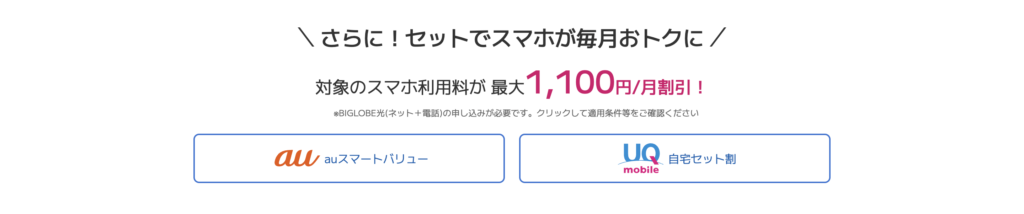 ビッグローブ光ではauまたはUQモバイルのスマホセット割を実施しています。