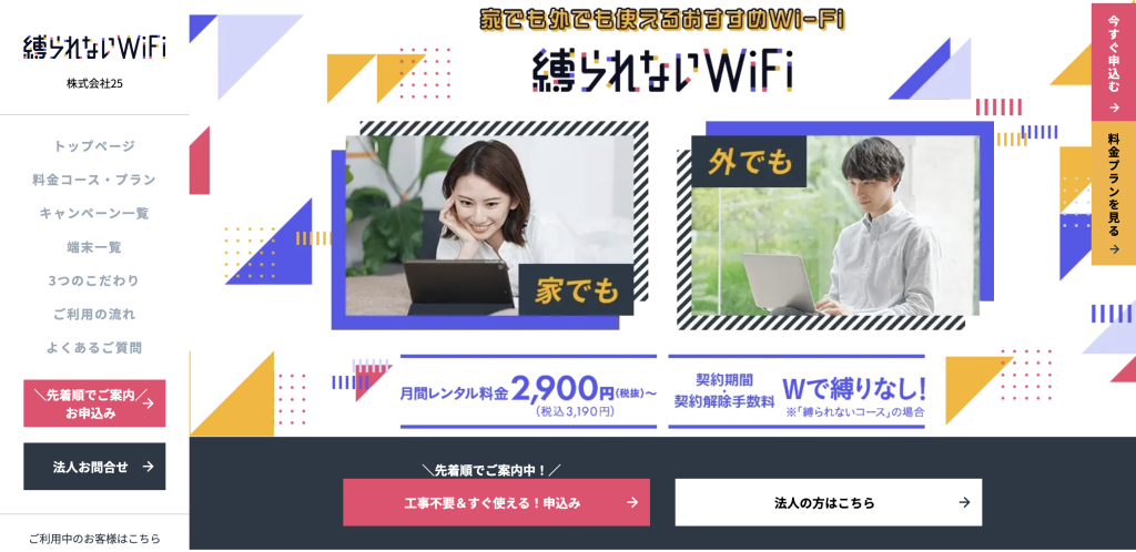 回線開通工事が不要なので初期費用が抑えられるのはもちろん、マンションやアパートといった賃貸物件にお住まいの方でも使いやすいのが特徴です。
