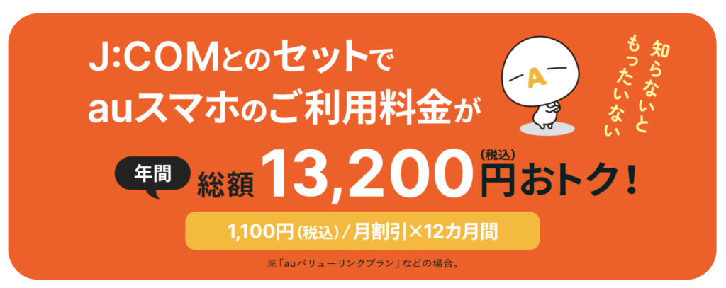 J:COM光を契約すると、auまたはUQモバイルのスマホ料金が毎月最大1,100円割引されるため、1年で総額13,200円もお得になります。