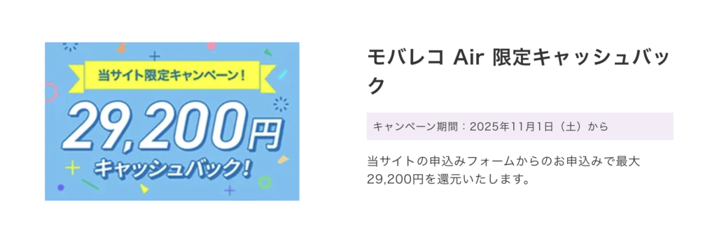 モバレコAirでは、新規登録で29,200円のキャッシュバックが受けられます。