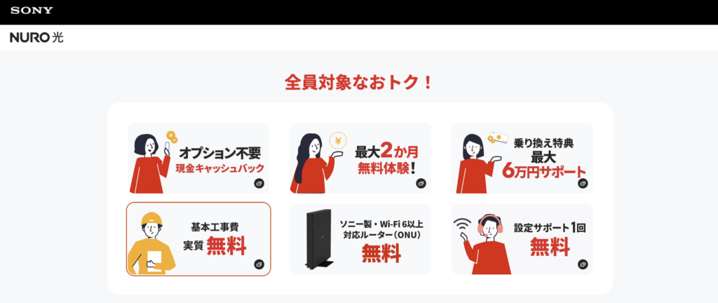 このキャッシュバック以外にも、NURO光公式の特設サイトから申し込みで、下記の内容も適用されます。