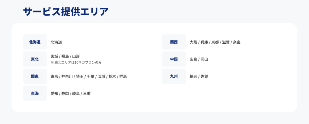 | 対応エリア | 北海道・宮城県・福島県・山形県・東京都・神奈川県・埼玉県・千葉県・茨城県・栃木県・群馬県・愛知県・静岡県・岐阜県・三重県・京都府・大阪府・兵庫県・ 滋賀県・奈良県・広島県・岡山県・福岡県・佐賀県 (※宮城県・福島県・山形県は10ギガのみ) |