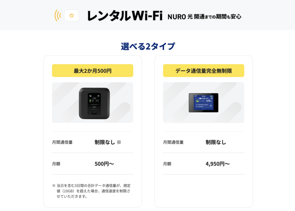 | NURO光の料金(戸建て) | 2ギガプラン:5,500円 10ギガプラン:6,050円 |
