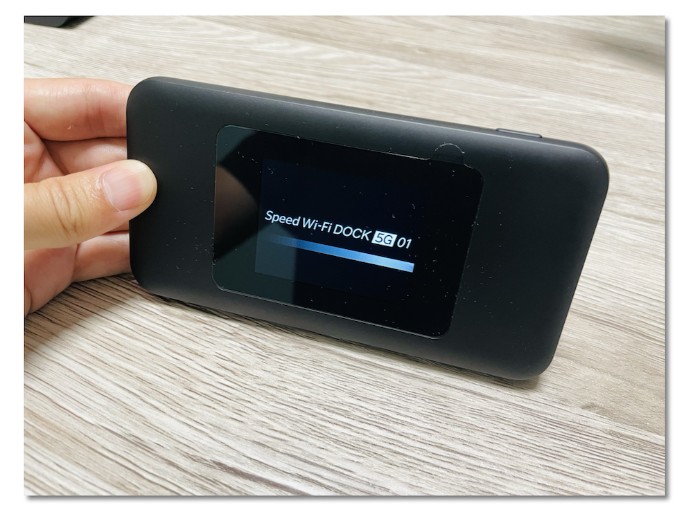 電源ボタンを長押しし、ディスプレイに「Speed Wi-Fi DOCK 5G 01」と表示されるまで待ちます。