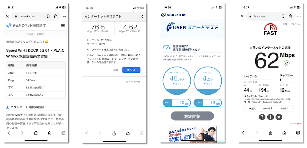 - 平均速度は下り約62Mbps・上り約12Mbpsで、日常利用なら十分安定している