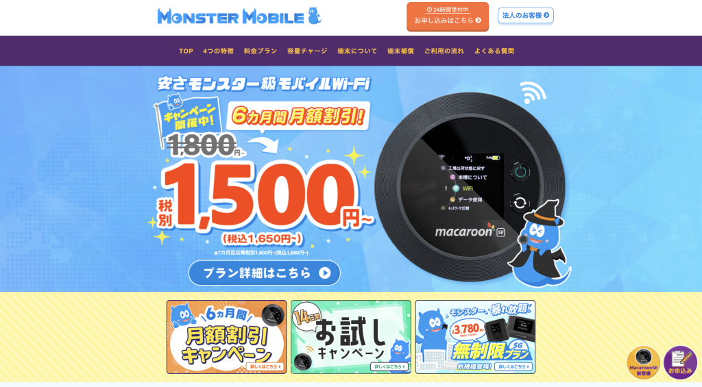 | モンスターモバイル | 下り:22.89Mbps 上り:5.9Mbps | 2,948円 | ・20GB:6ヶ月間1,650円 | 20GB〜無制限 |