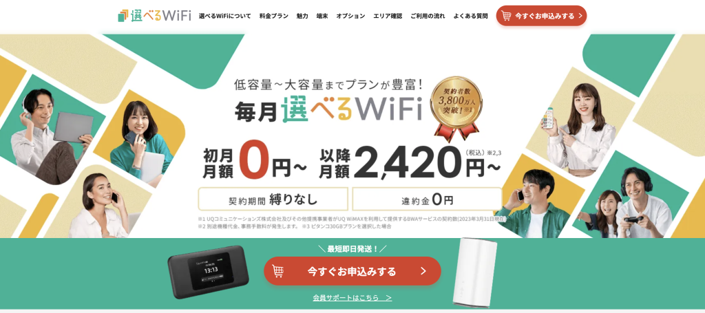 | 選べるWiFi | データなし | 2,860円〜 | 初月:無料 0GB:無料 30GB:2,420円 | 30GB〜無制限 |