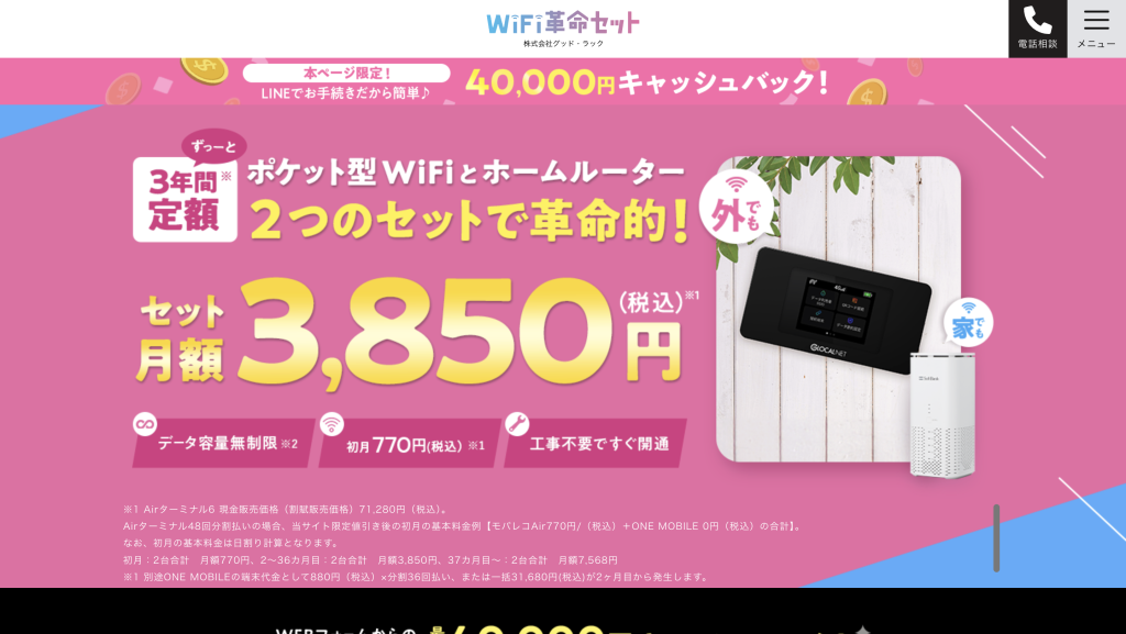 Wi-Fi革命セットは、ホームルーターとポケット型WiFiがセット利用できるサービスです。