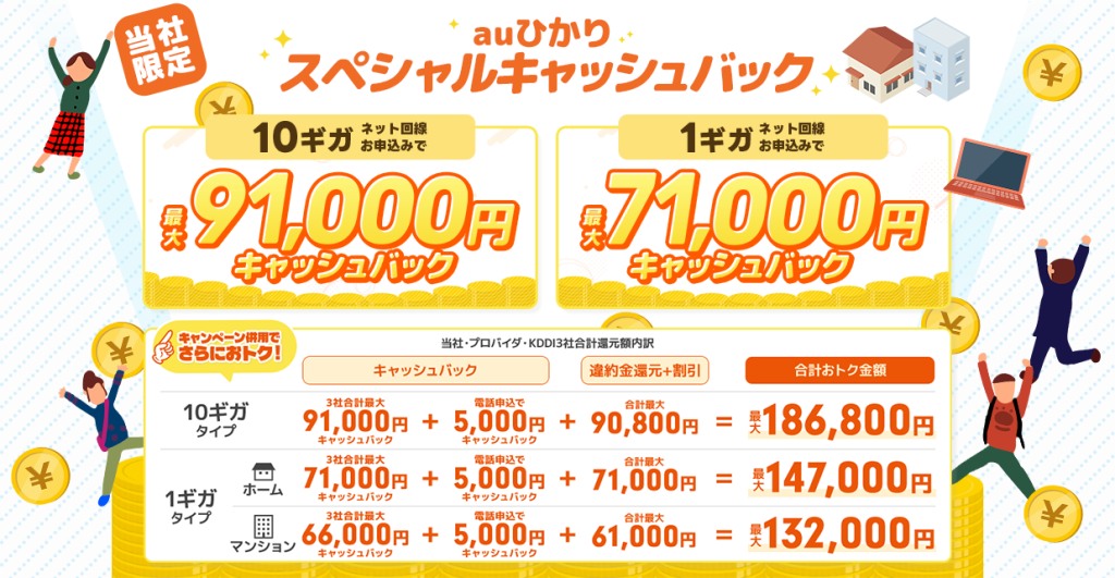 auひかりは、au・UQモバイルのスマホセット割が使える独立回線で、混雑しにくく安定した速度が出やすいのが特徴です。特に戸建てでは評価が高く、違約金相当額の還元キャンペーンも充実しています。