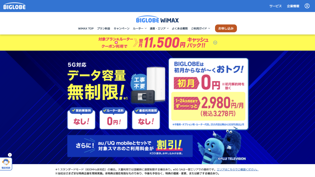さらに11,500円のキャッシュバックが受けられるため、お得感が大きいのがBIGLOBE WiMAXの特徴です。